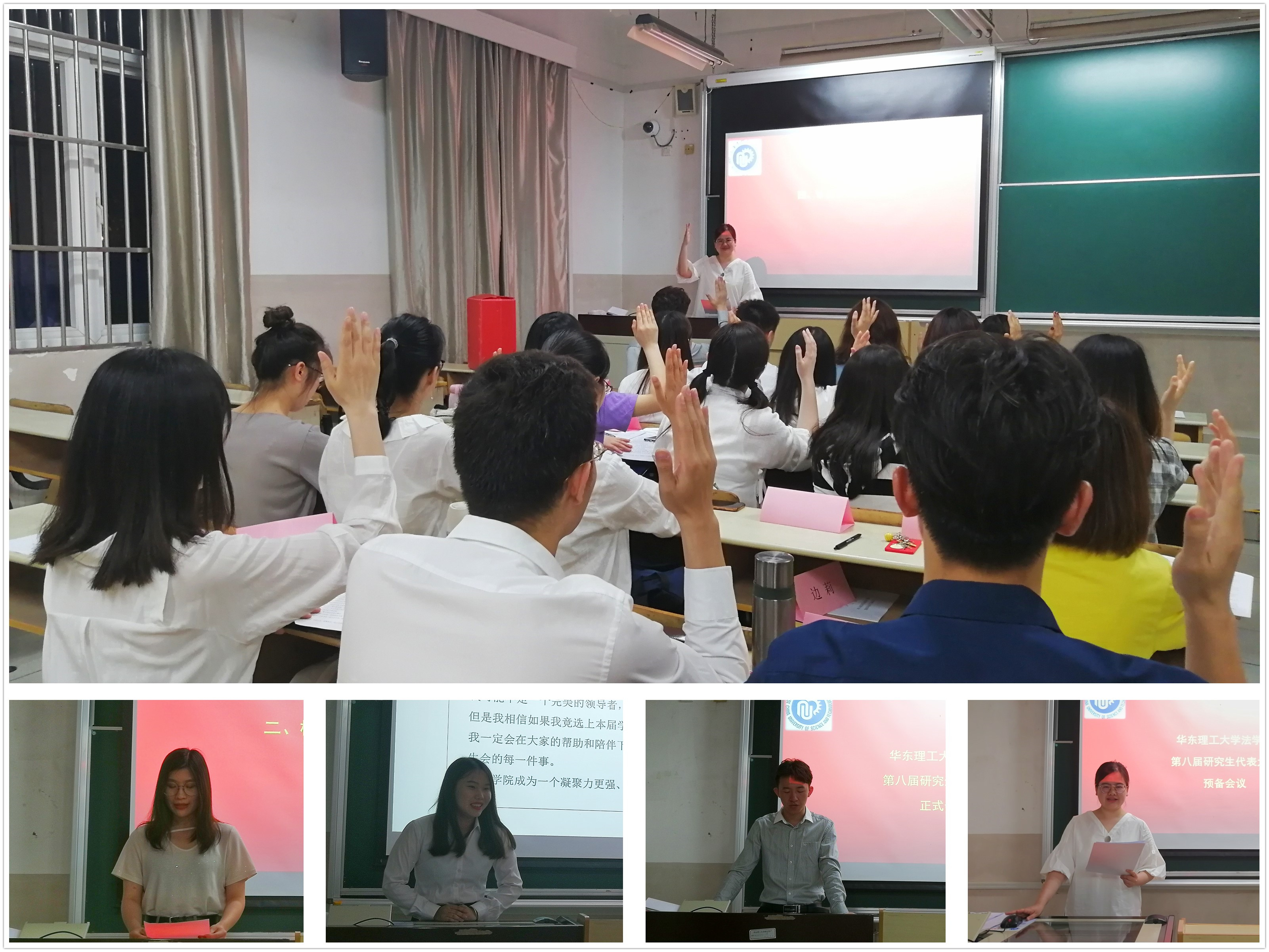 为审议通过9999js金沙老品牌第七届研究生会执行委员会工作报告,选举新一届9999js金沙老品牌研究生会执行机构,加强我院基层组织建设,更好地服务广大师生, 6月3日晚7点,9999js金沙老品牌第八次研究生代表大会于四教105召开。出席此次大会的嘉宾有9999js金沙老品牌团委书记李思杭、华东理工大学研究生会副主席鲍丹丹,以及9999js金沙老品牌第七届研究生委员会主任张放、9999js金沙老品牌第七届研究生会执行委员会主席吴胜寒等21名研究生代表。