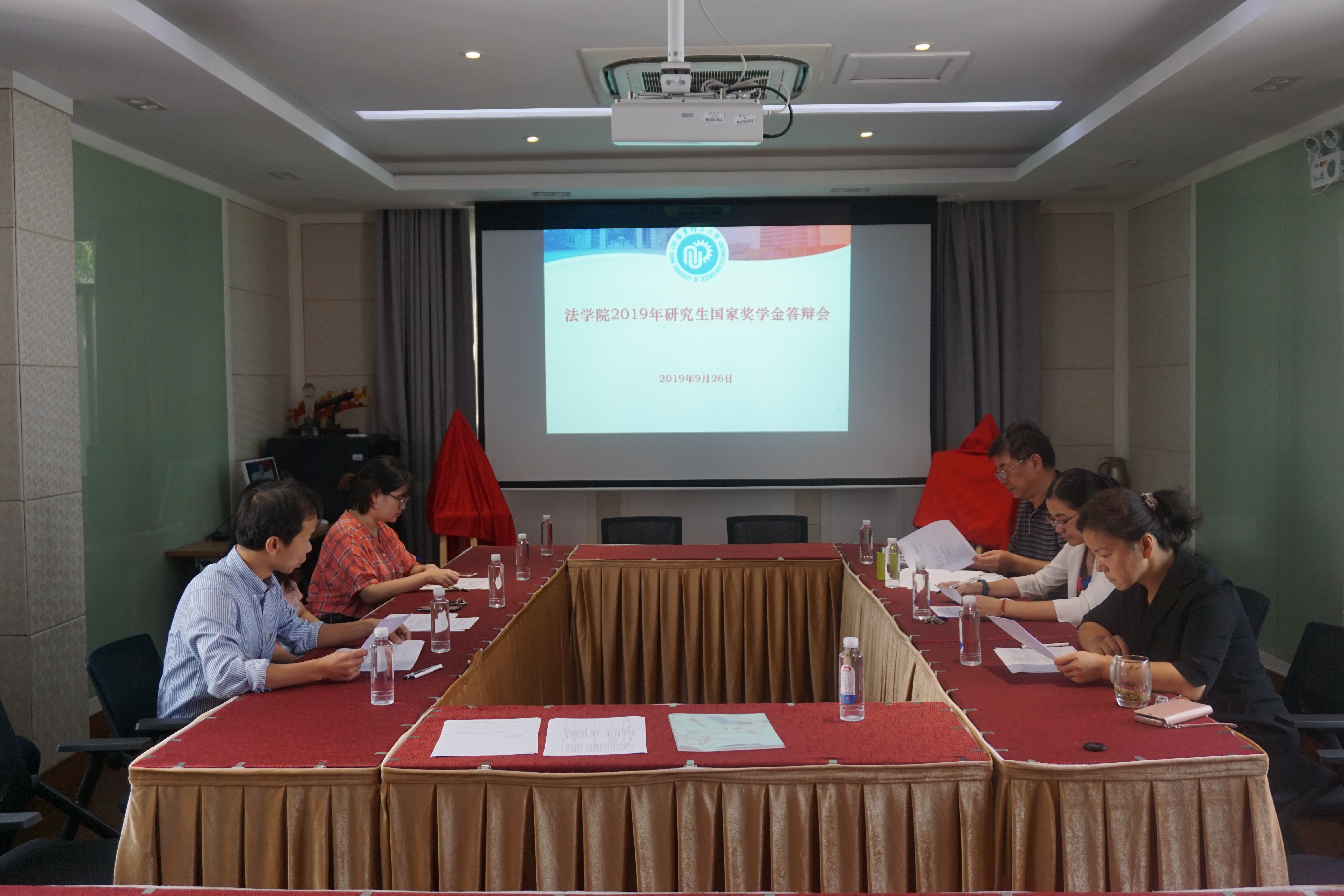 9月26日中午,9999js金沙老品牌在徐汇校区团结三楼310会议室举行了2019年研究生国家奖学金公开答辩会。党委书记丁灏、院长张昱、党委副书记周建国、研究生导师祝宁波、辅导员邵雪倩、学生代表杨雨涵担任本次答辩会评委。答辩会由周建国主持。