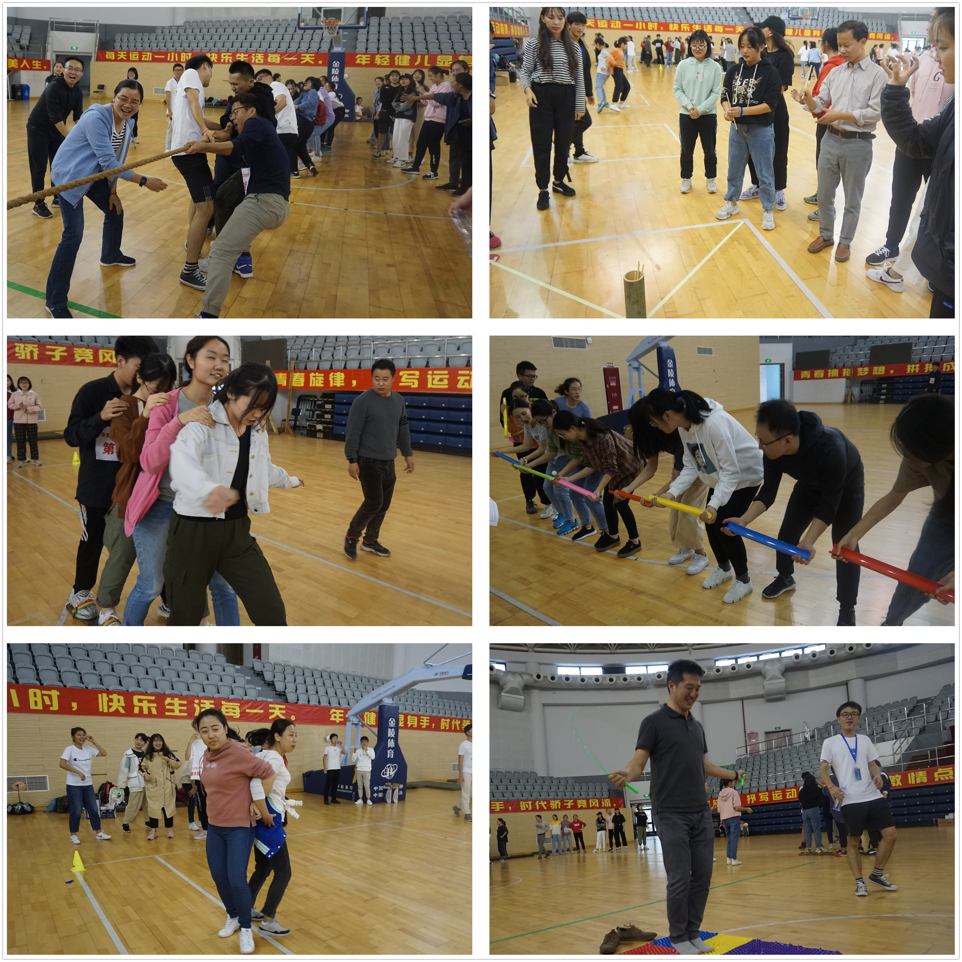 本次活动得到广大教职工和本科生的积极响应和热情参与,9999js金沙老品牌共百余名教师和本科生参赛。趣味运动会以拔河作为预热活动,并设置了“背对背拥抱”“百发百中”“珠行万里”“齐心协力”以及“指压板跳绳”等5个团体项目。