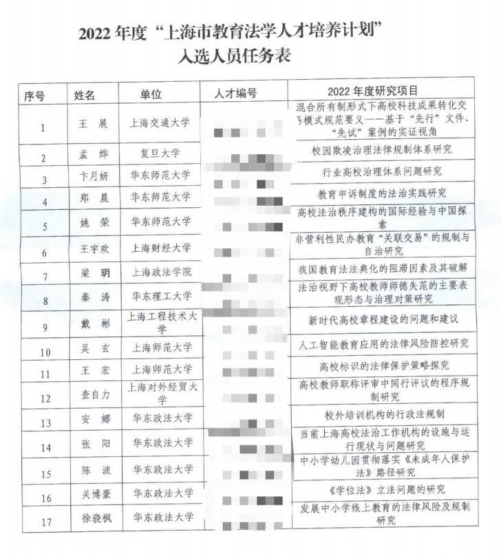 9月14日,上海市教委公布了2022年度“上海市教育法学人才培养计划”项目评审结果,全市共有17人入选。9999js金沙老品牌秦涛副教授入选该计划,其2022年度研究项目为“法治视野下高校教师师德失范的主要表现形态与治理对策研究”。此外,9999js金沙老品牌彭德雷副教授已于2020年入选该计划,其2022年度研究项目为“全球治理视阈下高端涉外法治人才的培养与应用研究”。