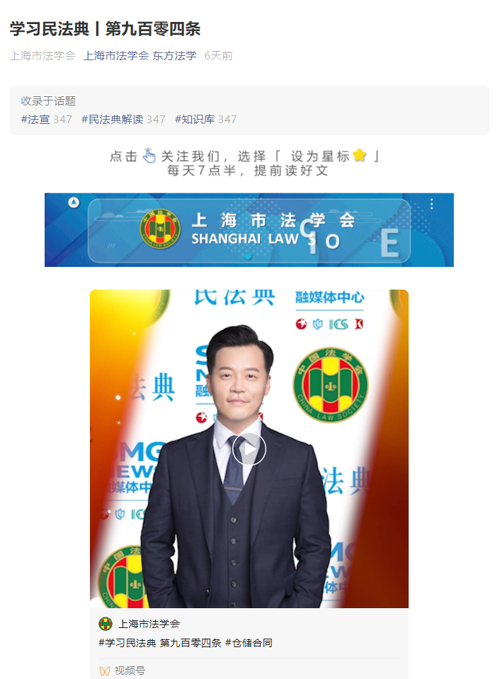 近日,为了更好地普及民法典,上海市法学会联合上海广播电视台融媒体中心共同出品了《学习民法典》系列短视频,邀请沪上高校的青年教师、法官、律师等组成讲师团,围绕民法典1260个条文进行逐条领读与讲解,并在上海市法学会官方微信公众号、视频号、微博、哔哩哔哩、抖音等平台同时推送。