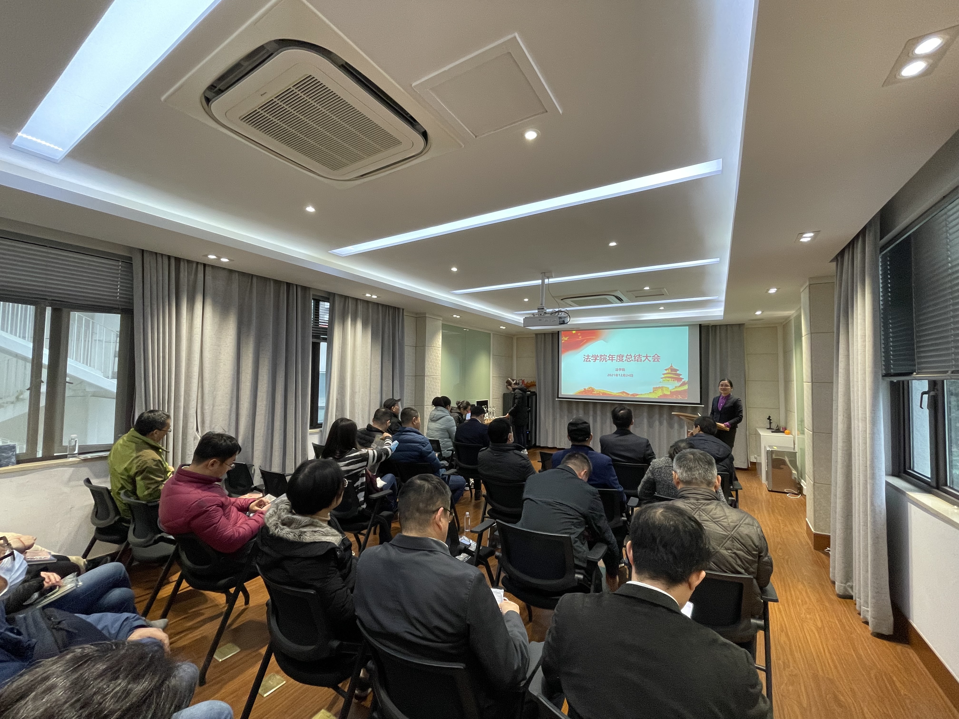 丁灏从年终绩效发放、疫情防控常态化、政治学习继续深化、关心关爱学生等方面进行总结。丁灏充分肯定了学院这一年所取得的成绩,感谢学院全体同仁面对各种困难的全力配合及辛勤付出。她希望下学期全体教师要充分利用好每周二下午的学习时间,组织好研究中心、教研室、党支部等的学习活动,提高团队的生命力和凝聚力。她希望在疫情防控常态化情况下,继续抓紧抓实抓细各项防控举措。她希望老师们加强师德师风建设,持续关注学生动态,将立德树人融入教育全过程。