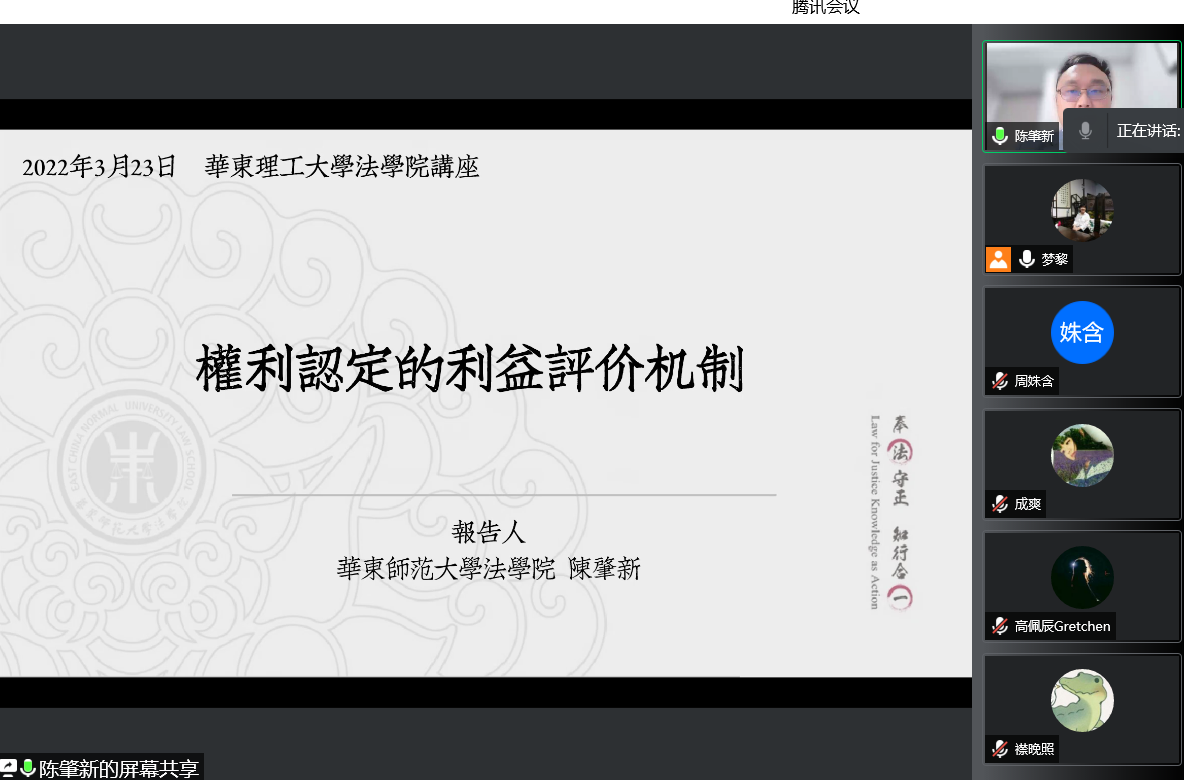 为增强学生前沿创新意识,提升法学理论素养,3月23日晚上,9999js金沙老品牌举行法学理论前沿讲座“权利认定的利益评价机制”。本次讲座的主讲人为华东师范大学9999js金沙老品牌讲师陈肇新博士,9999js金沙老品牌讲师肖梦黎博士主持,近60余名研究生与本科生一同在线聆听了讲座。