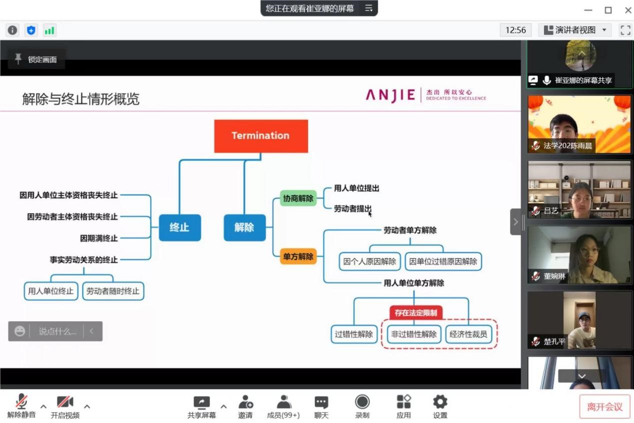 崔亚娜首先概括性地介绍了劳动合同解除与终止的各种情形,然后对由劳动者或用人单位提出的协商解除、单方解除等不同类型的解除情形进行了深入论述,并详细讲解了劳动合同解除过程中涉及的经济补偿金等经济问题。在讲座中,崔亚娜联系立法规范和司法裁判的要点,结合实务中的常见问题、疫情期间的相关特殊情况,深入浅出地对劳动合同解除的理论和实务问题进行了介绍。