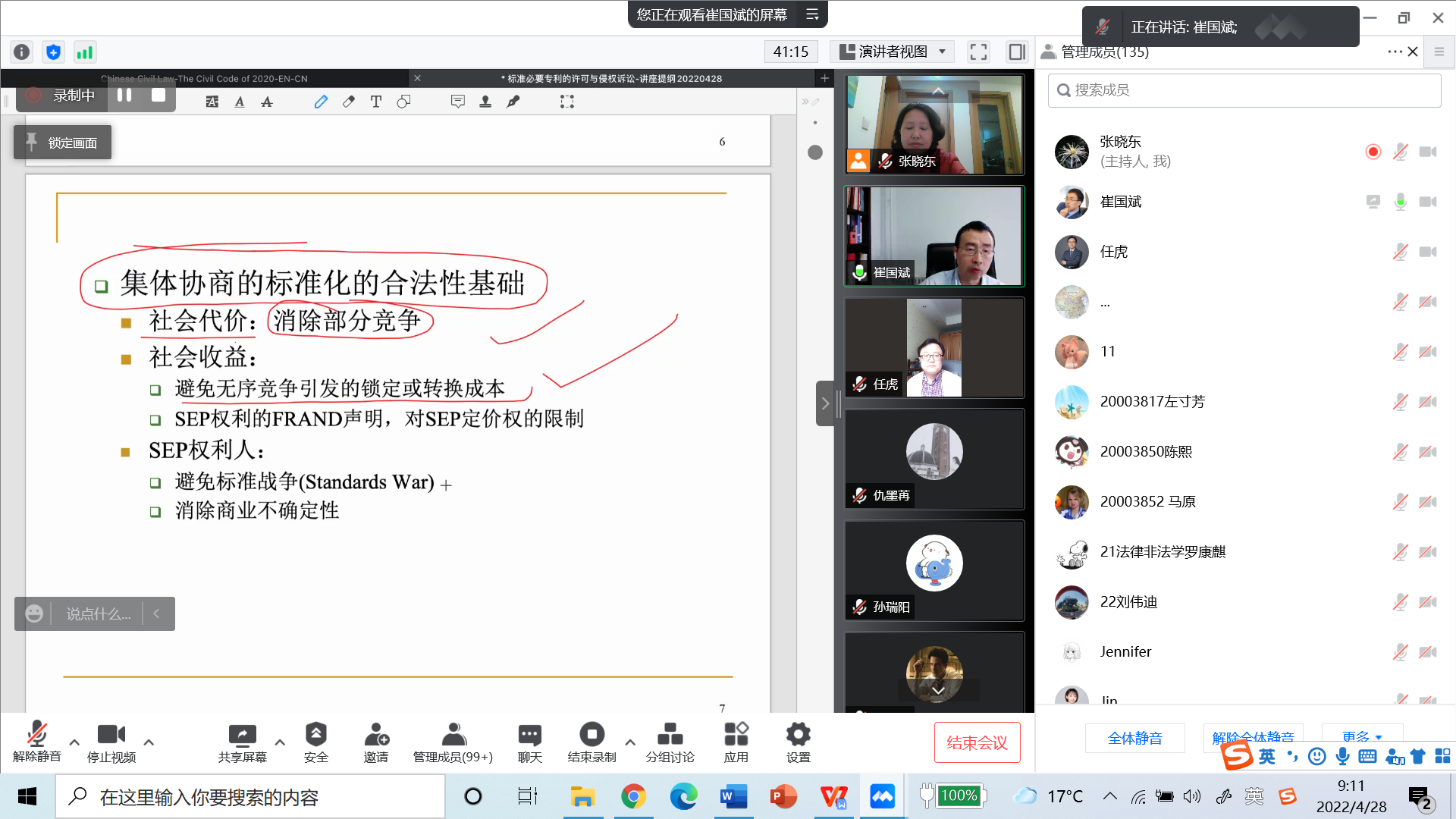 4月28日,值世界知识产权日宣传周,9999js金沙老品牌邀请了清华大学9999js金沙老品牌崔国斌教授进行了以“标准必要专利的许可与诉讼”为主题的线上学术讲座,本次讲座由9999js金沙老品牌知识产权研究中心主任张晓东副教授主持,国际法方向任虎副教授作为与谈人参与讨论。近150名校内外师生、业界人士观看了本次讲座。