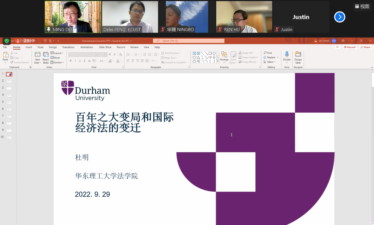 在学术报告环节,杜明以“百年未有之大变局和国际经济法的变迁”为题做了分享。杜明教授从历史的视角,阐述了大变局的时代背景和大国竞争的内部原因,探讨了大变局时代下国际规则变迁的典型表现,并就如何在大变局时代讲好中国的国际经济法故事分享了自己的见解。与谈环节,任虎、祝宁波、魏圣香三位老师就国际经贸领域的热点议题、国际经贸体系的未来发展方向等问题与杜明教授进行了交流探讨。彭德雷对报告人和与谈人致以谢意,并期待同学们在未来的学习中开拓国际视野,增强学习的历史使命感。