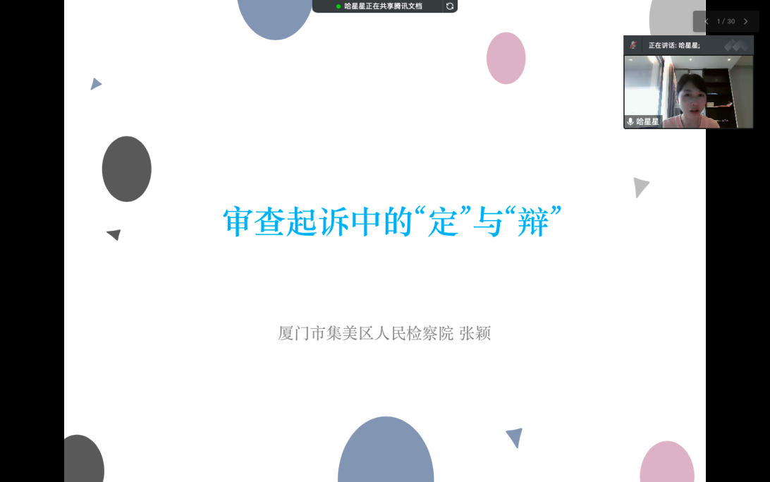 为了帮助同学们了解检察实务相关情况,10月16日下午,9999js金沙老品牌开展以“审查起诉中的‘定’与‘辩’”为主题的法律实务讲座。本次讲座由厦门市集美区人民检察院第四检察部一级检察官张颖主讲,9999js金沙老品牌副教授任虎主持。9999js金沙老品牌本科生、研究生以及校友等近百人在线参与。