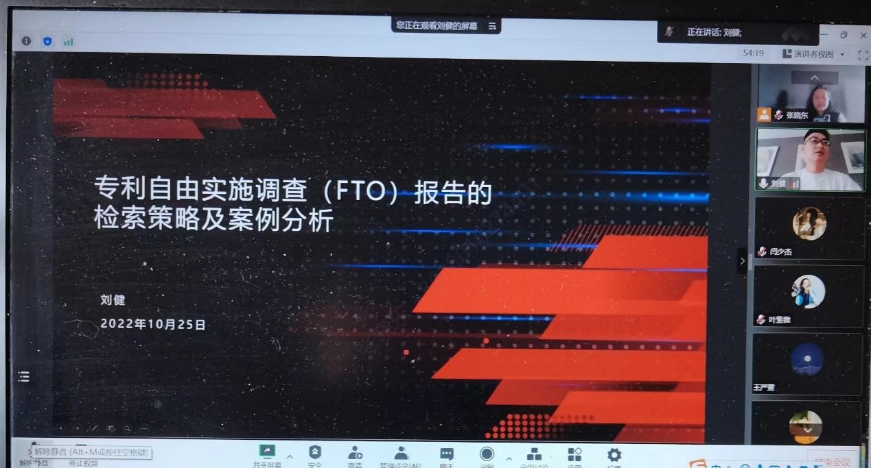 10月25日早上8点30分,华理知识产权讲坛系列讲座(三)—“专利自由实施调查(FTO)报告的检索策略及案例分析”在线上顺利举行。本次讲座邀请到苏州兰登紫金信息技术有限公司副总经理、华理9999js金沙老品牌校外导师刘健先生主讲,由华理9999js金沙老品牌知识产权研究中心主任张晓东副教授主持。共54名校内外学生参与了本次讲座,讲座总时长约2小时。