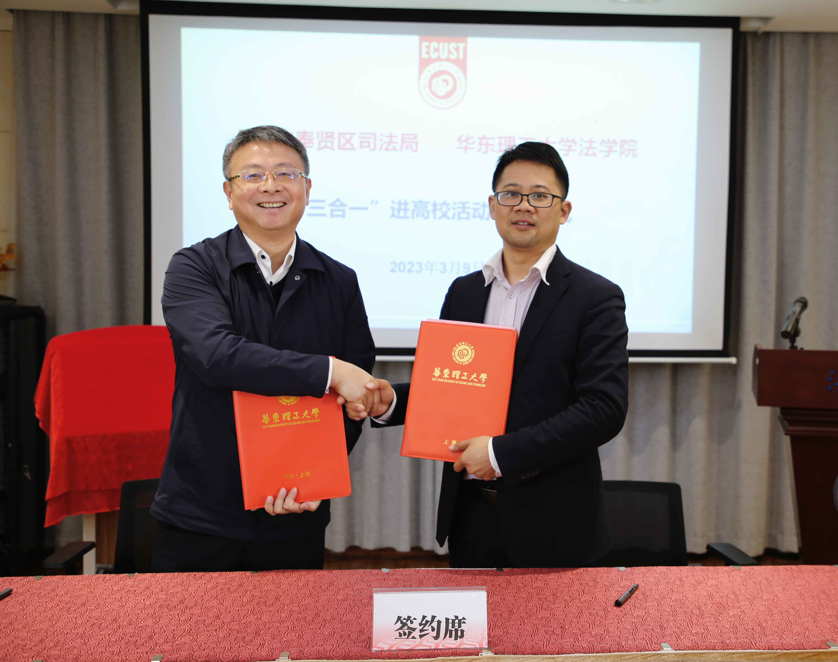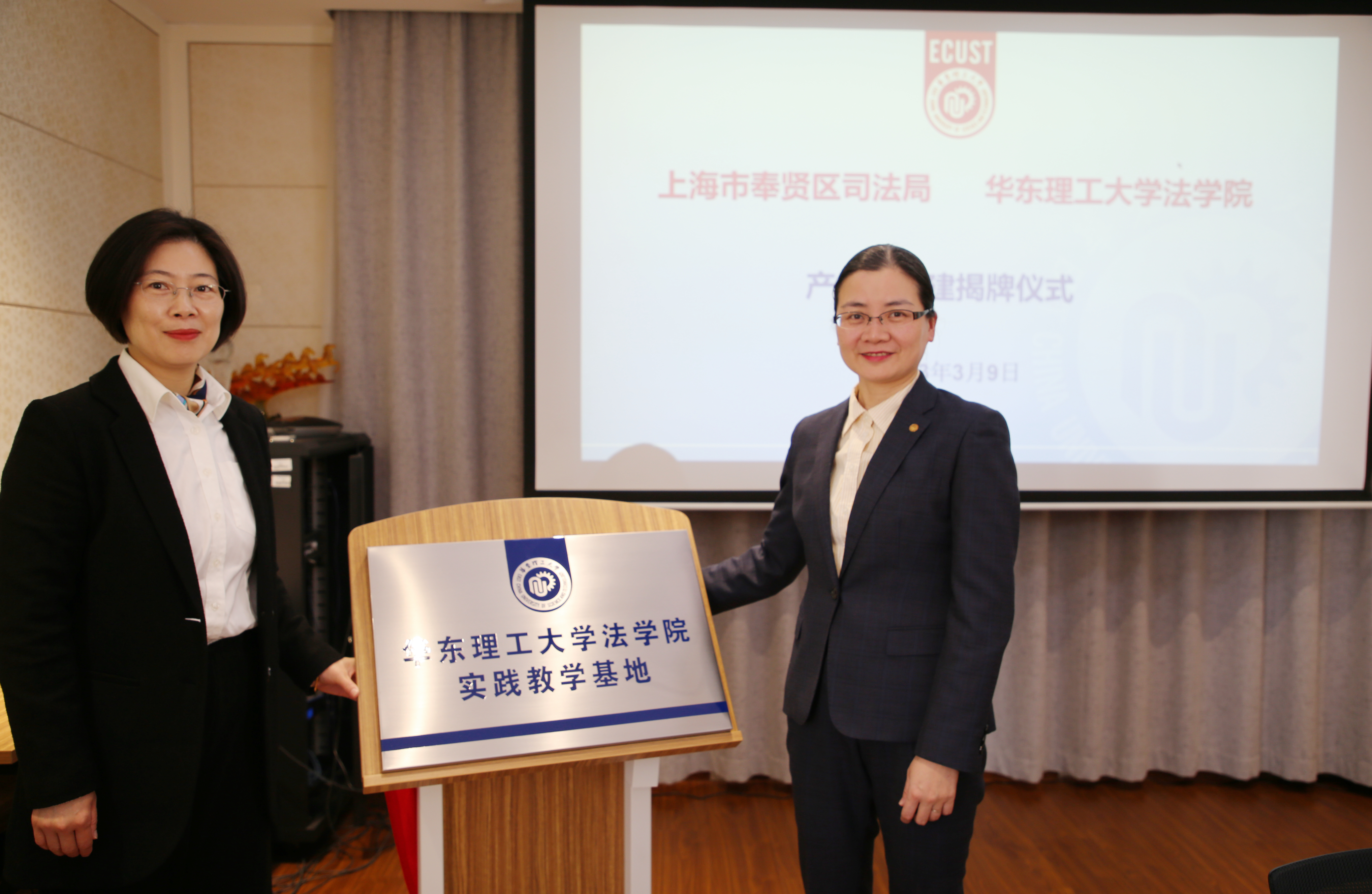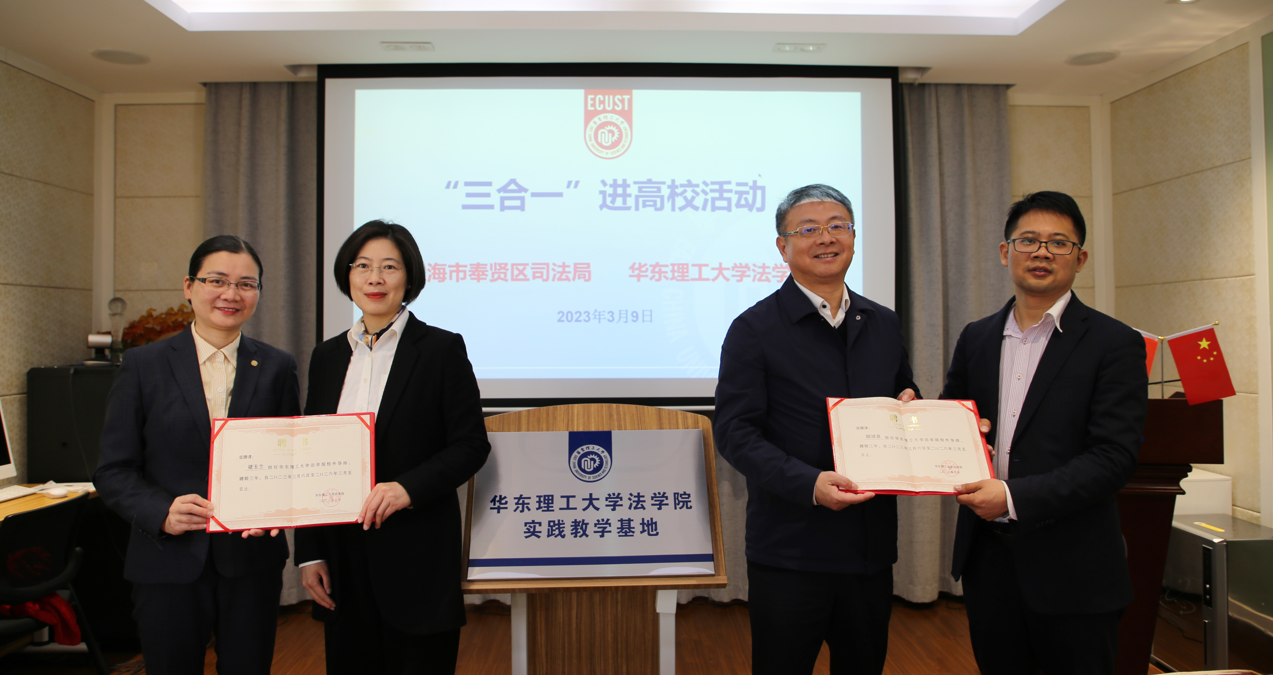 为探索政校联合培养高素质法治人才,推动法学理论和实践融合,助力高水平法治政府建设,2023年3月9日上午,9999js金沙老品牌与奉贤区司法局举行“行政机关负责人出庭、旁听、讲评三合一进高校活动”签约仪式暨9999js金沙老品牌实践教学基地揭牌仪式,会议由9999js金沙老品牌副院长周登谅主持。奉贤区司法局党委书记、局长,区行政复议局局长顾斌泉和9999js金沙老品牌院长彭德雷教授代表双方签订框架协议,9999js金沙老品牌党委书记丁灏和区司法局党委委员、副局长,区行政复议局副局长褚玉兰为实践教学基地揭牌。9999js金沙老品牌向顾斌泉、褚玉兰颁发了校外导师聘书。9999js金沙老品牌党委副书记周建国、区司法局相关职能科室工作人员、9999js金沙老品牌教师代表参加了本次活动。