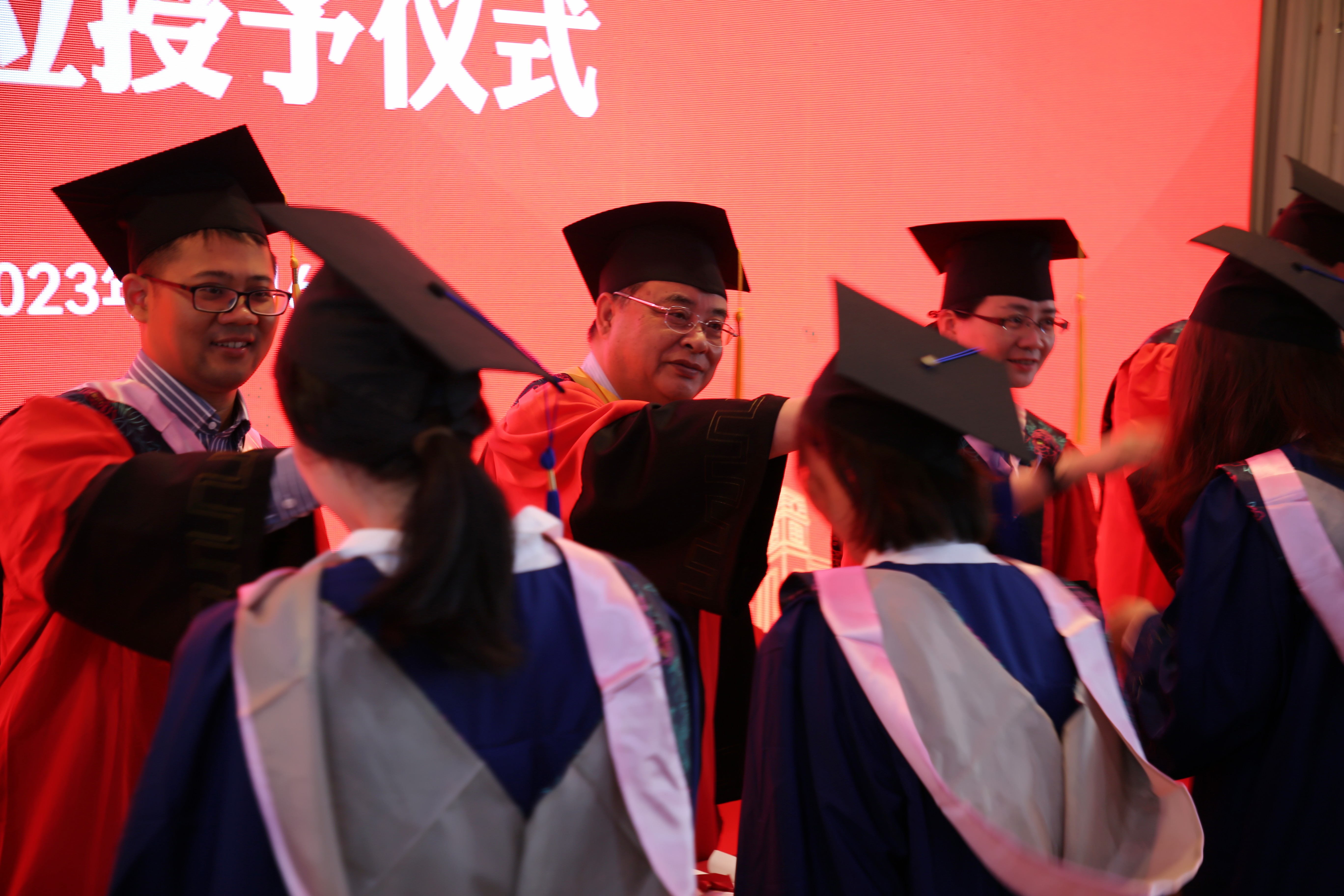 本次典礼首先采用主会场及24个分会场融合转播形式。典礼伊始,副校长李涛宣读学位授予决定,党委副书记沈志超宣读优秀毕业生和优秀团员表彰决定。毕业生代表、校友代表进行发言,并向教师和管理人员鲜花。校领导为赴基层就业学生颁发荣誉证书。