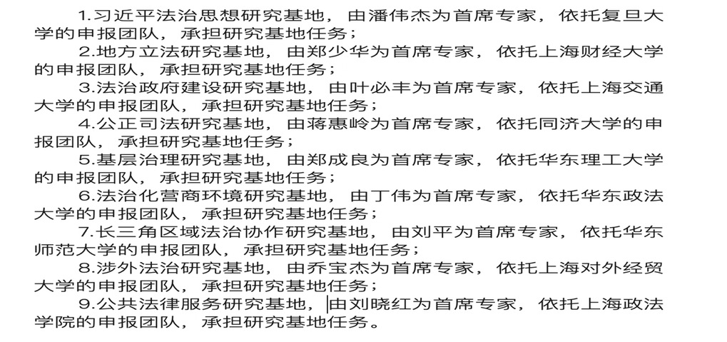 上海市全面依法治市研究基地,旨在紧密结合上海法治建设实践,充分发扬理论联系实际的学风,加强法治建设中实质问题的研究;有助于推进法学理论研究与实务相结合。据悉,通过前期申报、答辩、评审和严格筛选,另有复旦大学、上海交通大学等8所高校获批不同方向的研究基地。