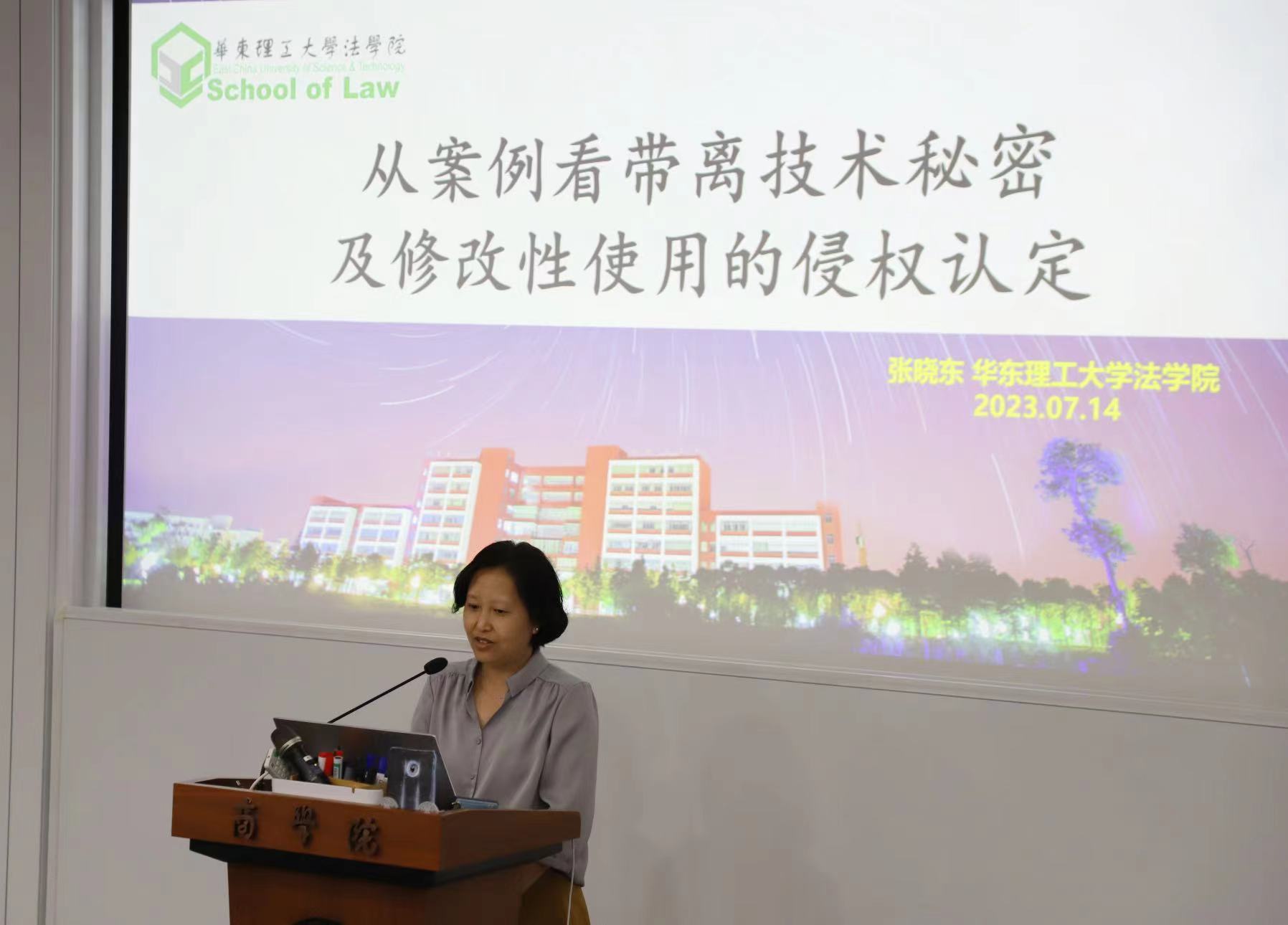 华理知识产权研究中心主任张晓东的分享主题为《从案例看携带走技术秘密及修改性使用的侵权认定》。张晓东教授指出了预谋性带离、违约备份性带离、在职期间转存备份等三种员工带离技术秘密方式,客观分析了“带离”案件中侵权认定的规则。在第二部分,张教授列举了技术秘密的三种使用方式,通过分析相关法条,明确了技术秘密修改性使用的侵权认定困境,探讨修改性使用在刑事责任认定中的可行性。