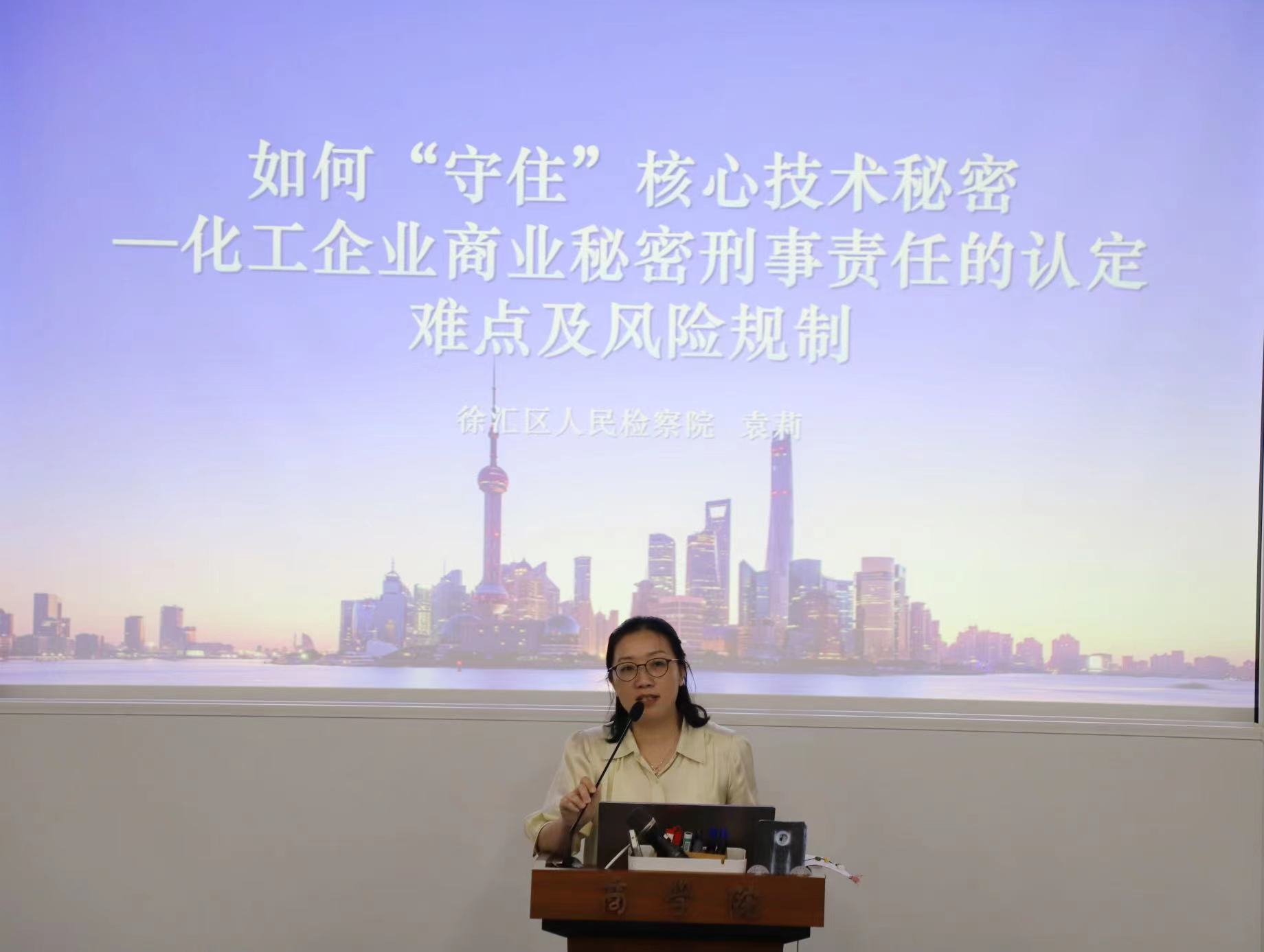 徐汇区检察院第三检察部主任、知识产权检察办公室主任袁莉的演讲题目为《如何“守住”核心技术秘密——化工企业商业秘密刑事责任的认定难点及风险规制》。袁检察官首先列举了商业秘密的类型与范围,然后通过分析化工企业被侵犯商业秘密定罪的刑事责任认定难点与争议点,指出商业秘密必备的三个特征,包括秘密性、保密性、价值性。最后袁莉检察官提出了商业秘密泄密的风险防范措施,从而守住核心技术。