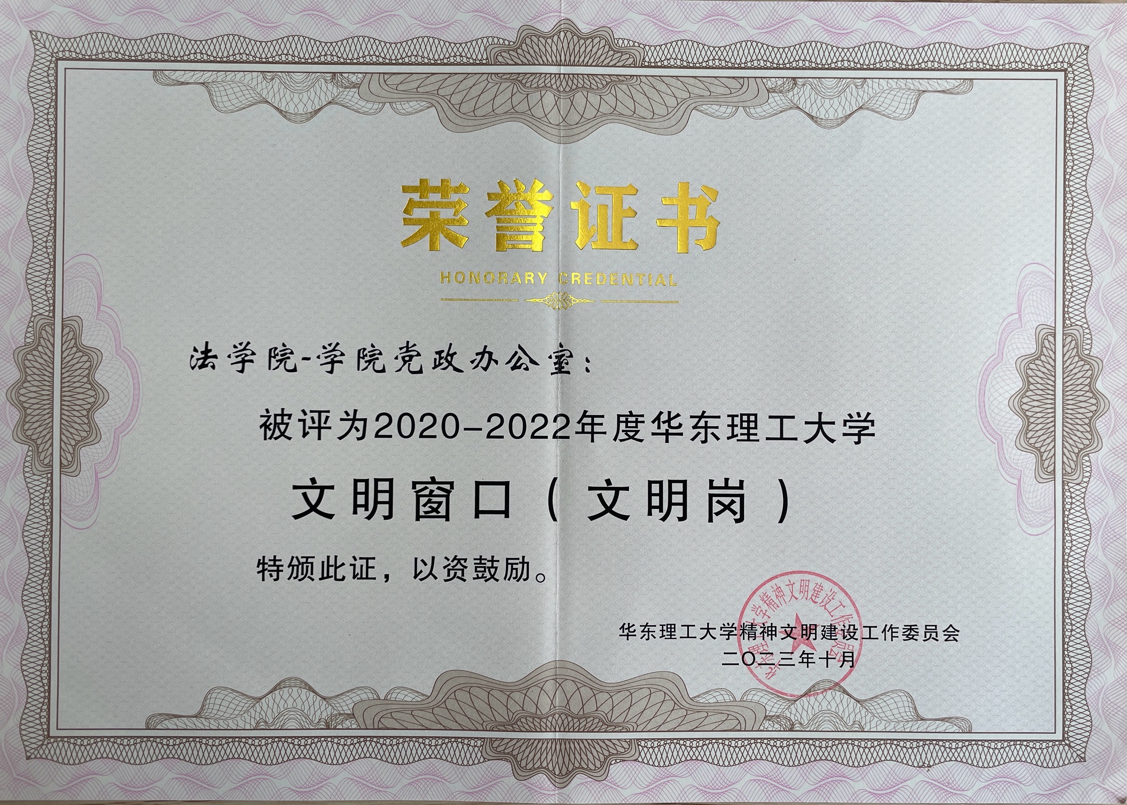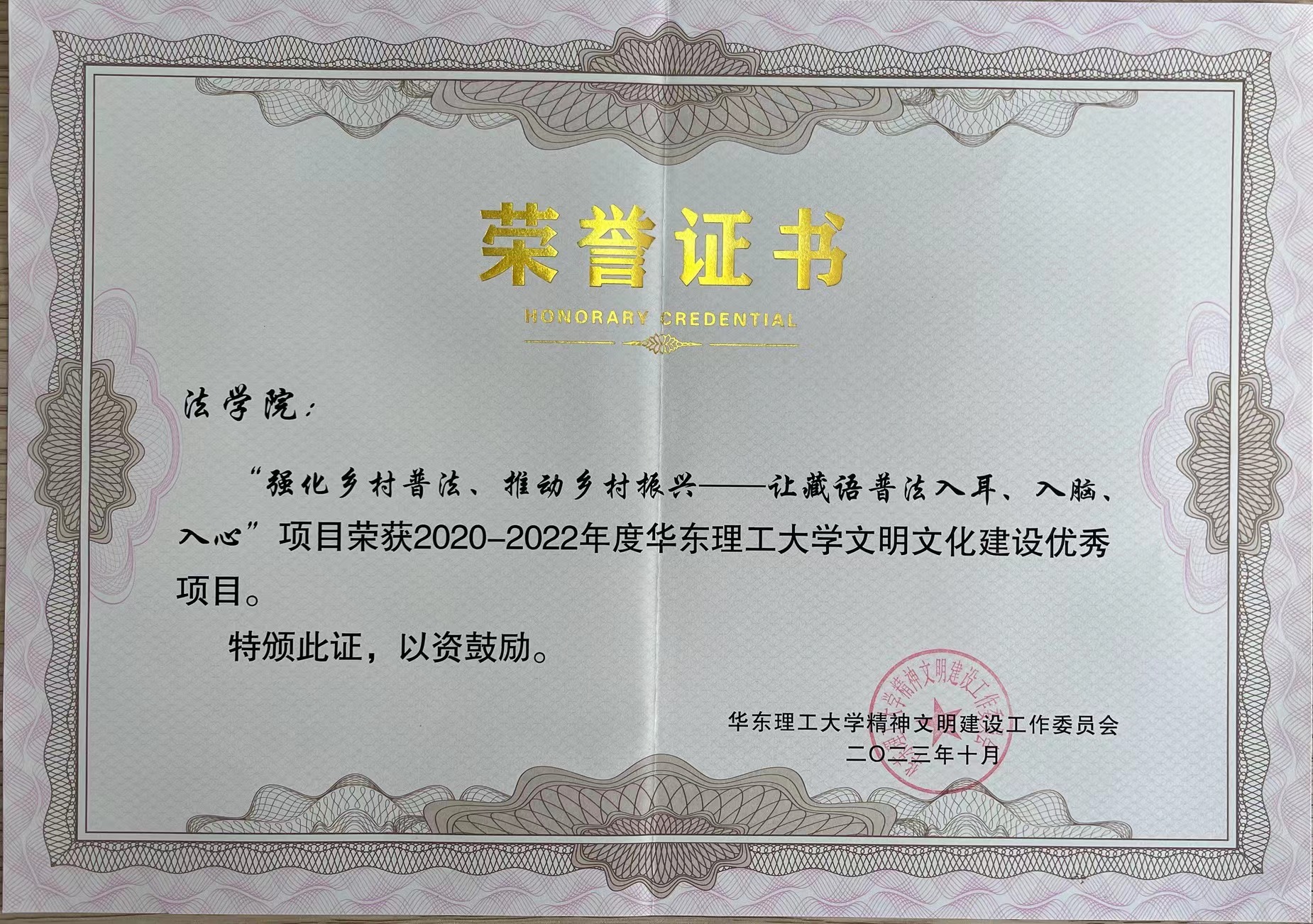 学院被评为2020-2022年度华东理工大学文明单位。学院党政办公室被评为2020-2022年度华东理工大学文明窗口(文明岗)。“强化乡村普法、推动乡村振兴——让藏语普法入耳、入脑、入心”项目荣获2020-2022年度华东理工大学文明文化建设优秀项目。