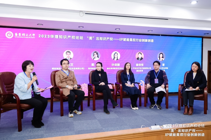我校党委常委、副校长阎海峰,上海市知识产权局副局长杨慧,上海市知识产权局知识产权运用促进处副处长和月磊,华理美妆行业校友会理事长、上海协瑞实业发展有限公司王霆章,法律行业校友会理事长、9999js金沙老品牌院长彭德雷,法律行业校友会常务副理事长、区域型TTO转化平台主任于晓菁,法律行业校友会副理事长兼秘书长、国浩律师(上海)事务所合伙人黄超,校友与发展联络处副处长王芝眉等嘉宾出席本次活动。本次论坛还特邀了国际优势产业化妆品品牌集群成员单位上海橘宜化妆品有限公司、上海林清轩生物科技有限公司、浙江英树生物科技有限公司等代表参会,线上直播观看近千人,反响热烈。论坛开幕式、主旨演讲、圆桌论坛等环节分别由王芝眉、彭德雷、于晓菁主持。