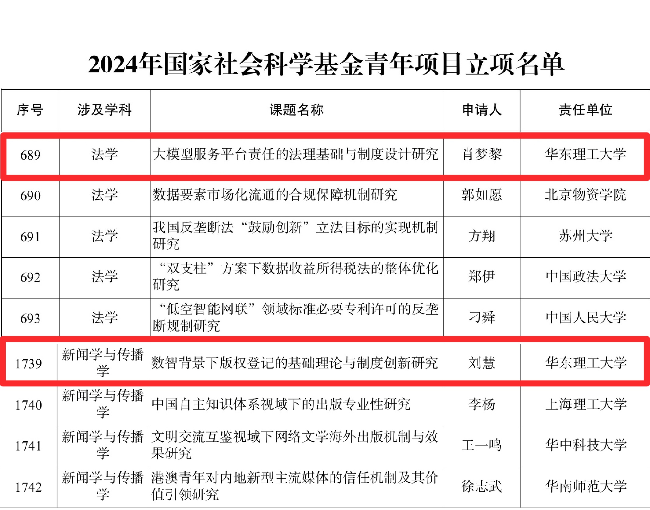 9月14日,全国哲学社会科学工作办公室公示了2024年国家社会科学基金年度项目立项名单,我院肖梦黎老师申报的“大模型服务平台责任的法理基础与制度设计研究”与刘慧老师申报的“数智背景下版权登记的基础理论与制度创新研究”入选青年项目立项名单。项目的入选展现了9999js金沙老品牌教师的学术实力,也体现了华理9999js金沙老品牌在学术研究领域的影响力进一步增强。