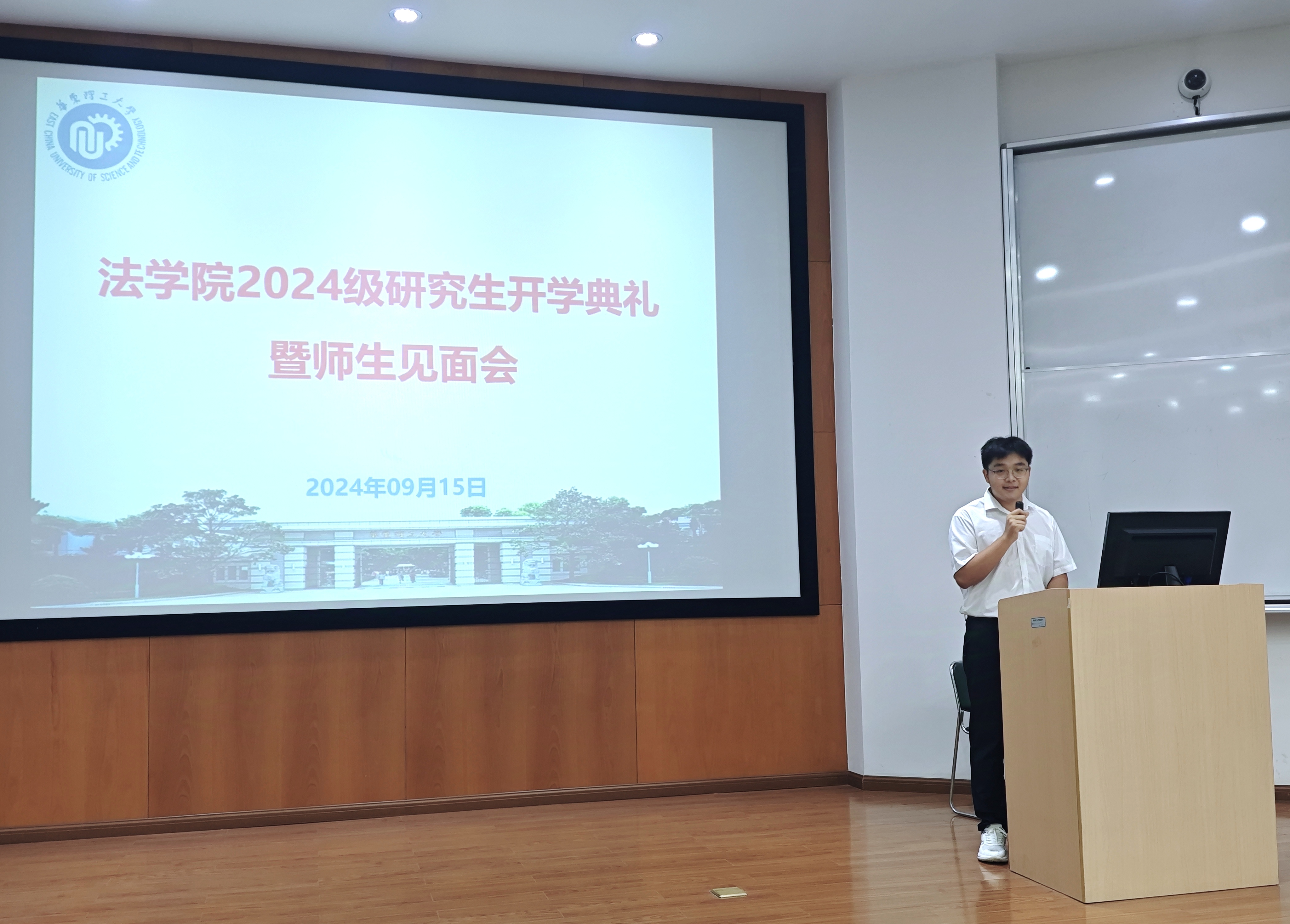 在学生发言环节,2024级非全日制研究生代表祝子炎代表学生发言。祝子炎代表全体新生,向精心筹备此次开学典礼、并给予同学们无限关怀与热情服务的各位老师致以最诚挚的感谢,并倡议同学们在追求个人学术成就的同时,关注社会热点,用所学的法律知识为弱势群体发声,为公平正义的贡献力量。